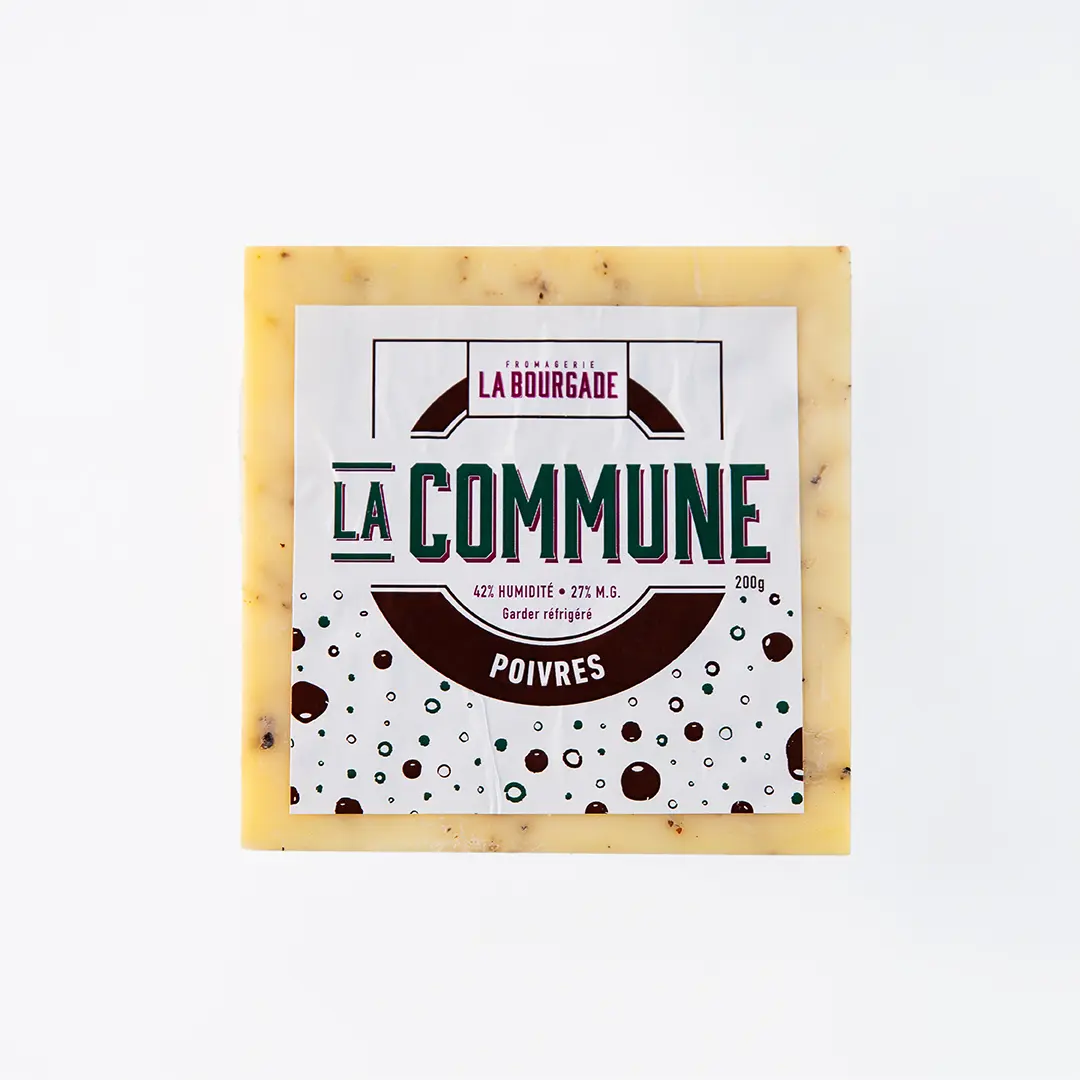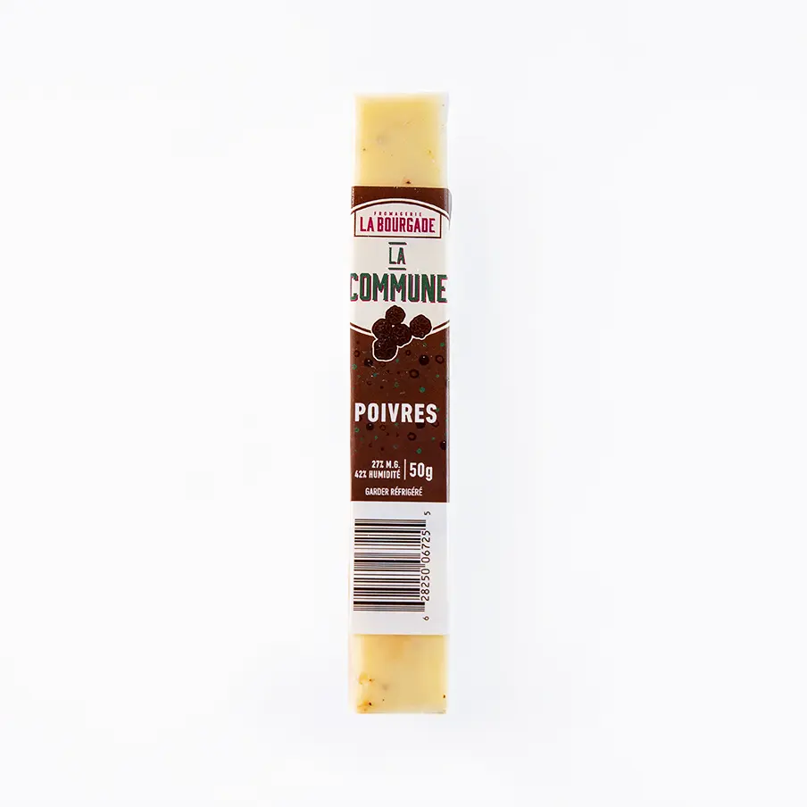 Aspect | Un fromage blanc avec des inclusions noires, légèrement plus corsé due à l’ajout de gros grains de poivres à notre cheddar artisanal. |